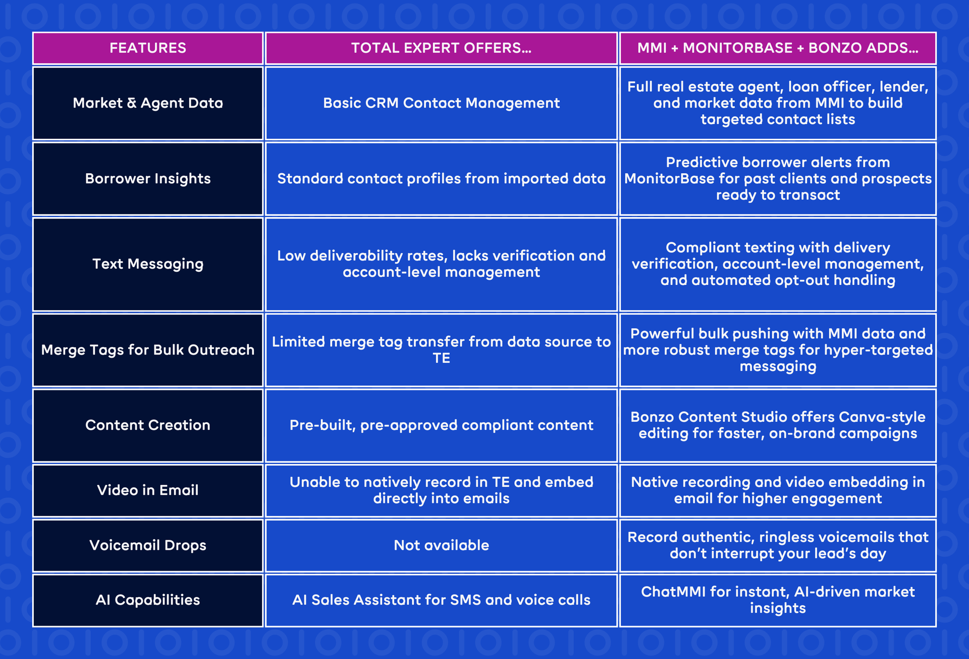 If you’re using Total Expert, you already have a solid CRM foundation—but it lacks the data, communication tools, and compliance features that actually drive revenue. That’s where MMI + MonitorBase + Bonzo transform your CRM from a database into a deal engine.